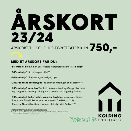DET ER IKKE MULIGT AT KØBE ÅRSKORT EFTER D. 4. JUNI 2024. TIL GENGÆLD FÅR DU 20% RABAT PÅ ALLE BILLETTTER VED KØB AF MINIMUM 3 BILLETTER TIL FORSKELLIGE FORESTILLINGER UANSET, HVILKET TEATER DU KØBER BILLETTER TIL.